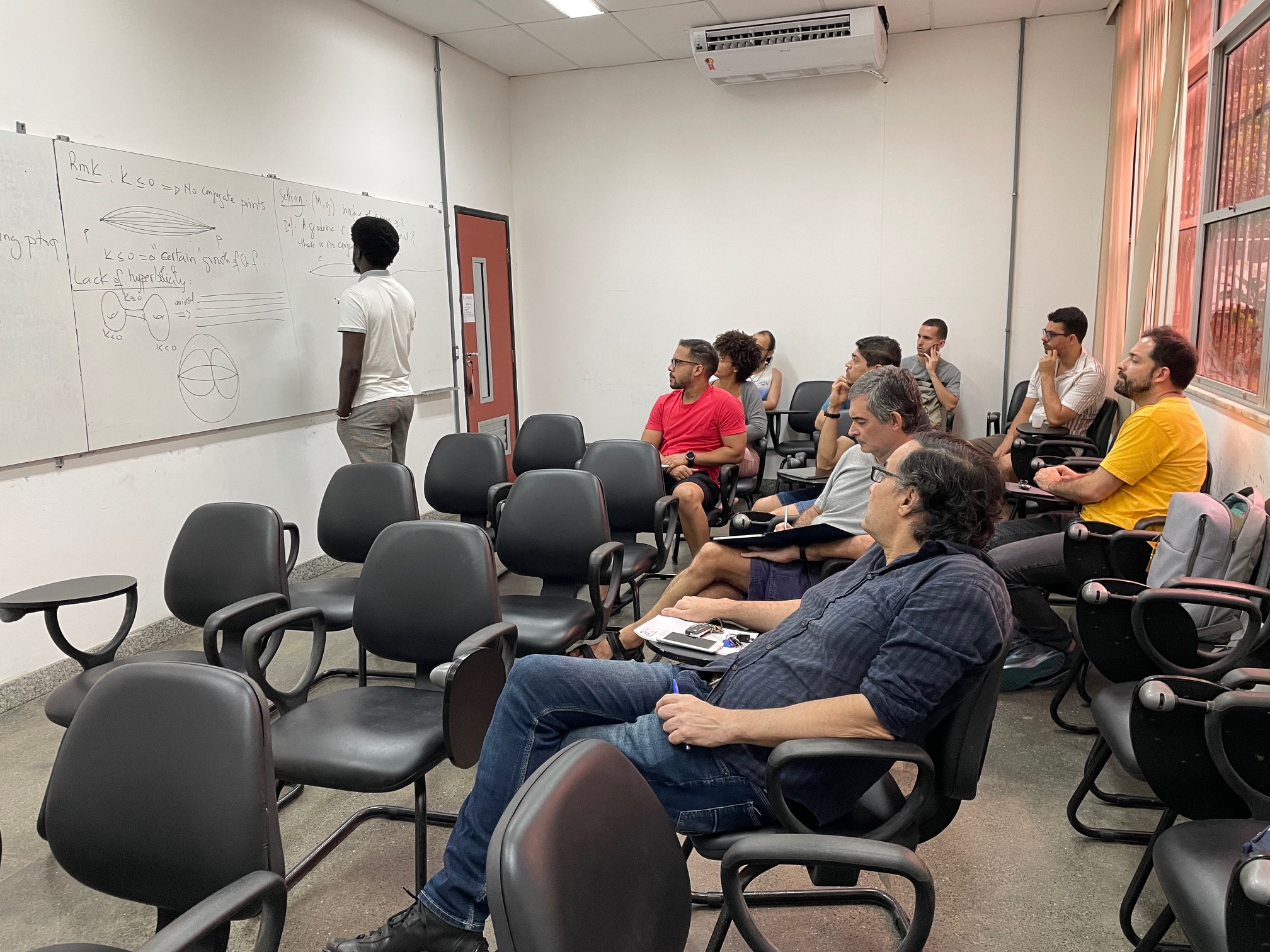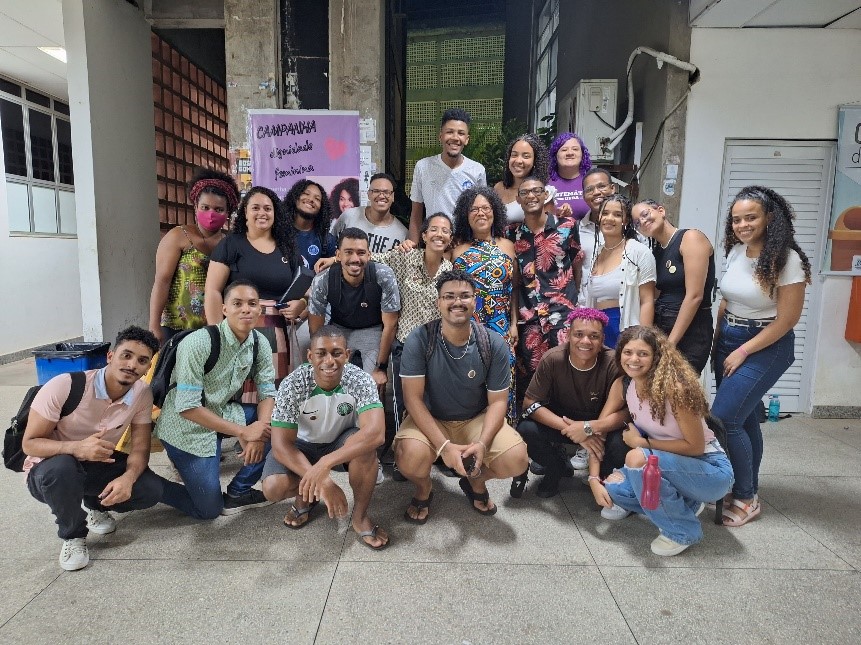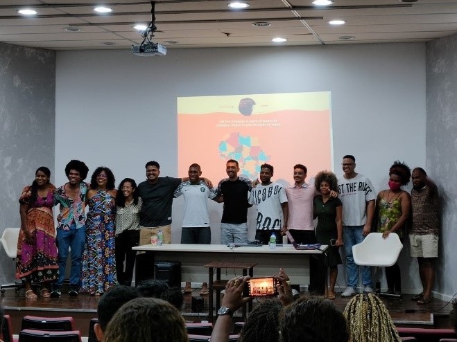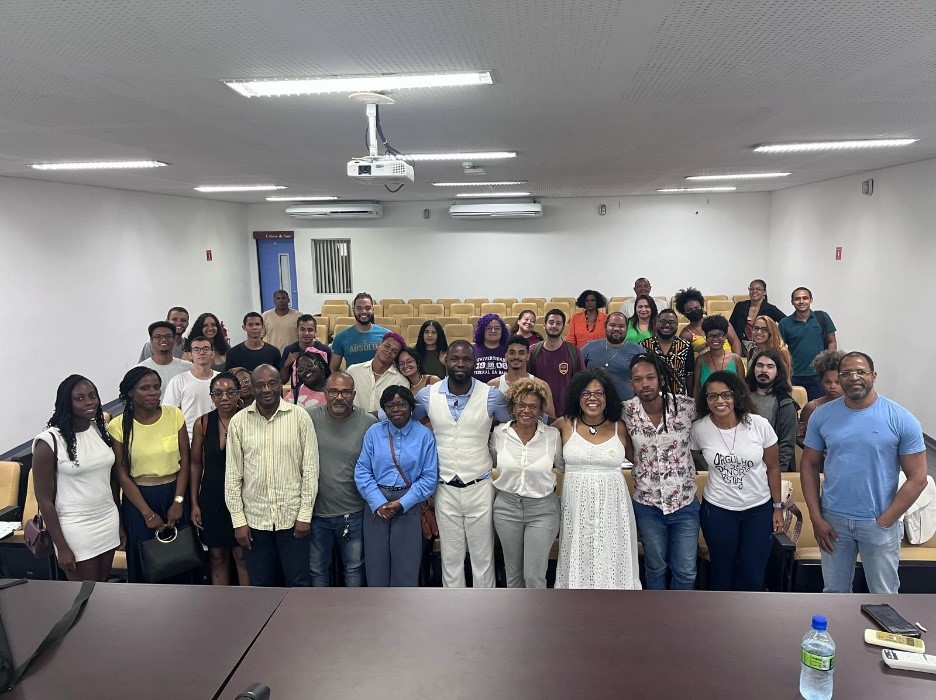 Em novembro de 2023, como parte das celebrações do Novembro Negro, o Ondjango Asili auxiliou a Superintendência de Relações Internacionais da UFBA na promoção da palestra “Extensão de corpos e teoria de Galois”, proferida pelo Prof. Massingacala Paulo Sebastião, da Université de Technologie de Compiégne. A atividade ocorreu no Auditório do IME-UFBA, no dia 17 às 15h, com a presença da superintendente Wlamyra Ribeiro Albuquerque. Após a palestra, houve uma roda de conversa com o Prof. Massingacala, estudantes de Matemática e docentes do DMAT, sobre os temas da palestra e sobre a representatividade de negros nas ciências exatas (Fig. 13).