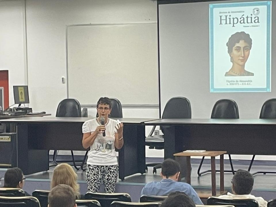 Na ocasião, houve a importante fala da professora Lindamir Casagrande (UTFPR), a qual fez uma bela explanação sobre a história de Hipátia, uma matemática contemporânea do século IV d.C. em Alexandria, com contribuições nas áreas de Aritmética, Geometria e Filosofia, e também símbolo inspirador desta revista (Fig. 7).