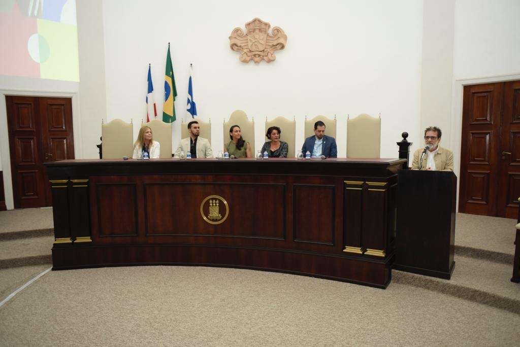 A cerimônia contou com a presença do Magnífico Reitor da UFBA, Sr. Paulo Cesar Miguez de Oliveira, além de Secretários da Educação e representantes das Secretarias de Educação de Salvador, Camaçari, Madre de Deus, Vera Cruz e do Estado da Bahia. Integrando a mesa principal tivemos Erika Sholl, Coordenadora de Logística da OBMEP em todo o Brasil; Prof. Roberto Sant’Anna, Coordenador Regional da OBMEP; Prof. Kleyber Mota, Diretor do IME-UFBA; Prof.a Elaís Cidely, Coordenadora local do PICME-UFBA; e Prof.a Glória Fernandes, Coordenadora Estadual do PIC-Bahia (Fig. 2).
