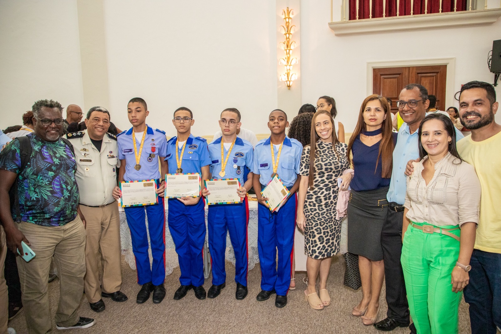 Como em toda competição, os melhores participantes são premiados com medalhas e a Cerimônia de Premiação da OMEBA ocorreu no dia 30 de Novembro de 2023 no Salão Nobre da Reitoria da UFBA, em Salvador (Fig. 4). A ilustre cerimônia ocorreu com a presença dos professores Kleyber Mota da Cunha, representando o IME-UFBA; Darllan Conceição Pinto, representando o DMAT; Evandro Carlos Ferreira dos Santos, na ocasião representando a OMEBA; além da professora Vanessa Balbina da Silva Lopes Miguel, da Escola SESI Djalma Pessoa, e o professor Antônio Márcio de Lima Soares, do Instituto Federal da Bahia (IFBA) representando os professores das escolas participantes (Fig. 5). Quase uma centena de alunos e alunas foram homenageados com medalhas de bronze, prata e ouro, devido ao seu desempenho nos três níveis de competição.